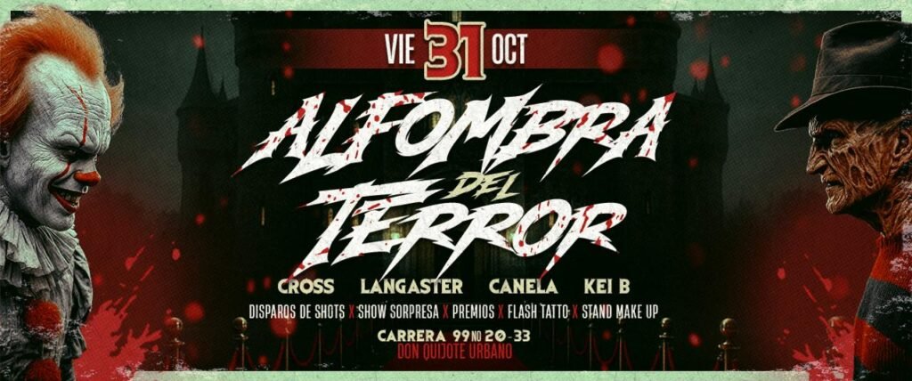 ALFOMBRA DEL TERROR -31 OCT URBANOPor Don Quijote Music Hall / 20/10/2025 31/10/2025 7:00 PM - 01/11/2025 2:45 AM Carrera 99 No. 20-33- Don Quijote Urbano