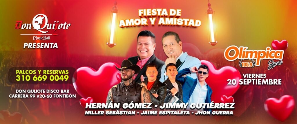 FIESTA DE AMOR Y AMISTADPor Don Quijote Music Hall / 27/08/2024 20/09/2024 7:00 PM Don Quijote Music Cra 99 # 20- 60 Fontibón -Bogotá
