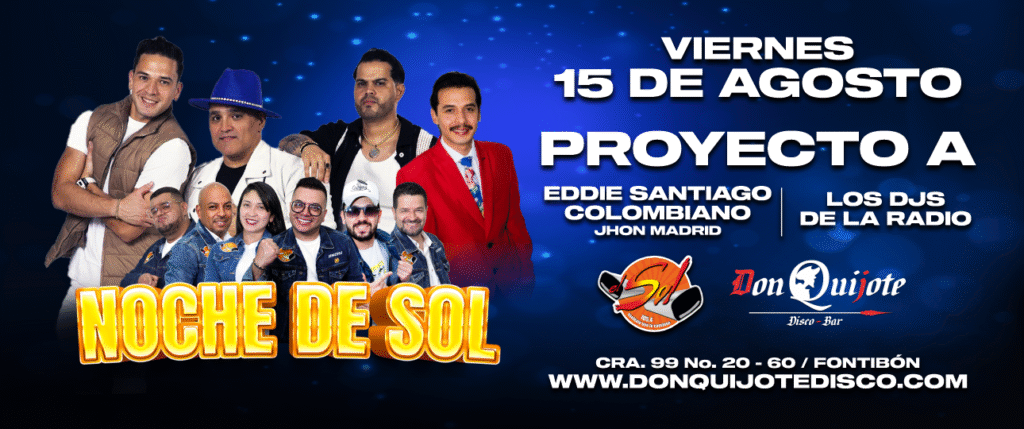 NOCHE DE SOL con PROYECTO A & EDDIE SANTIAGO COL.Por Don Quijote Music Hall / 11/07/2025 15/08/2025 7:00 PM - 16/08/2025 2:45 AM Don Quijote Music Cra 99 # 20- 60 Fontibón -Bogotá